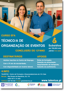 | Designação | Duração | Local | Início | Custo | | Técnico/a Auxiliar de Saúde | 2020H | Coimbra | 02-12-2025 | 0,00€ | | Assistente Familiar e de Apoio à Comunidade | 1520H | Figueira da Foz | 15-12-2025 | 0,00€ | | Técnico/a de Organização de Eventos | 2070H | Gaia | 12-01-2026 | 0,00€ | | Agente em Geriatria | 1500H | Pombal | 22-12-2025 | 0,00€ | | Técnico/a Auxiliar de Saúde | 2020H | Porto | 15-12-2025 | 0,00€ | | Operador/a de Logística | 1520 | Porto | 22-12-2025 | 0,00€ | | Técnico/a Auxiliar de Saúde | 2020H | Viseu | 11-12-2025 | 0,00€ | | Cuidador/a de Crianças e Jovens | 1420H | Viseu | 19-12-2025 | 0,00€ |